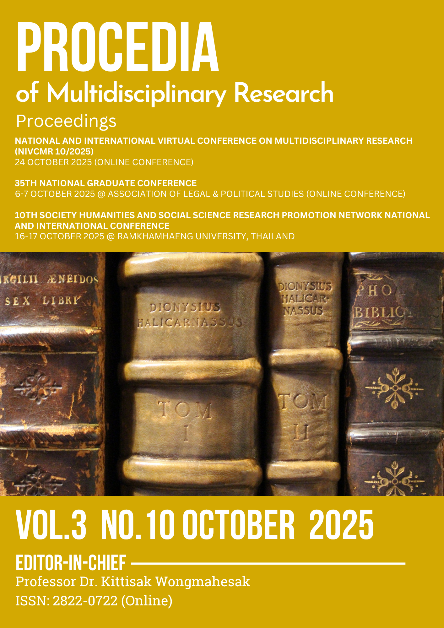 Vol. 3 No. 11 (2025)Procedia of Multidisciplinary Research (e-ISSN: 2822-0722) is an all-science, international open-access peer reviewed e-conference proceedings series published monthly by the Association of Legal & Political Studies (Thailand) and White Tiger Legal Business and Research Consultants Co., Ltd. (Thailand). It was created as a platform for publishing high-quality interdisciplinary abstracts/papers, in English, Chinese and Thai, which are considered to be presented at ALPS-WTLBRC conferences and their networks.